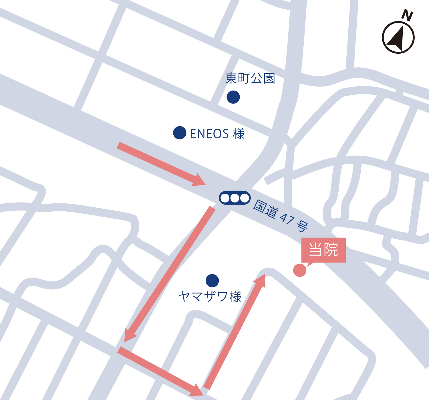 クリニック正面の国道47号線は西側(酒田市街方面)から来ると中央分離帯があり右折が出来ません。 図のようにクリニック手前の交差点を右折し、ヤマザワ様の後方から回ってお越しください。